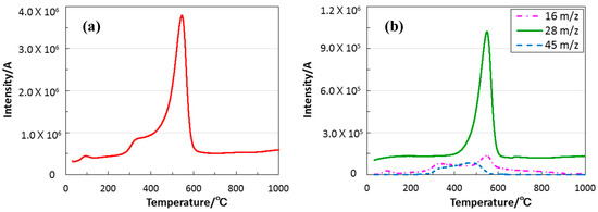 The TG-curve that was measured in He was quite similar to the previous one in N2 (Figure 3b), and the gaseous species formed in-situ were mainly detected during the main weight loss at 300 to 600 °C. As-shown in Figure 5a, the total ion current chromatogram (TICC) spectrum showed a broad bimodal signal composed of a weak peak at 300 to 400 °C, and a dominant one at 400 to 600 °C. The simultaneous MS analysis resulted in the detection of three kinds of gaseous species at the m/z ratios of 45, 28, and 16 (Figure 5b).