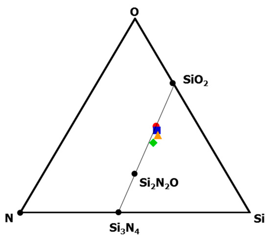 Compositions of EtOSZ-derived samples after pyrolysis at 800 °C (■), and subsequent heat treatment at 1400 °C (0.3Si2N2O: 0.3SiO2: 0.1Si, ♦), 1600 °C (0.25Si2N2O: 0.375SiO2: 0.125Si, ▲), and 1800 °C (0.2Si2N2O: 0.4SiO2: 0.2Si, ●) in N2.