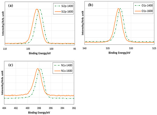 X-ray photoelectron spectroscopy (XPS) spectra for 1400 °C- and 1600 °C-heat treated samples; (a) Si2p; (b) O1s; and (c) N1s regions.
