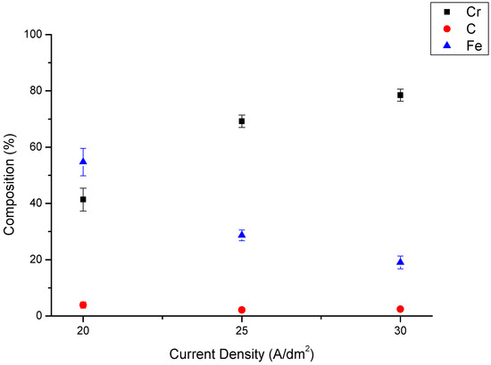 Figure 1 shows the Cr, Fe and C concentrations in the Cr-Fe-C alloy deposits prepared with electroplating current densities of 20, 25 and 30 ASD. The examination of Figure 1 shows that the Cr content in a Cr-Fe-C alloy deposit increases with an increasing the electroplating current density; specifically, 41.4 wt % and 78.5 wt % Cr were measured for 20 ASD and 30 ASD, respectively. Conversely, the Fe content in the Cr-Fe-C alloy deposit decreases with increasing electroplating current density, indicating that a Fe-based alloy deposit can be obtained with an electroplating current density lower than 20 ASD, whereas a Cr-based alloy deposit requires 25 or more ASD. Because the Fe2+/Fe reduction potential is higher than that of Cr3+/Cr, a Fe-based alloy deposit can be obtained at a relatively low cathodic overpotential or electroplating current density regardless of the presence of a small amount of Fe2+ ions in the electroplating bath. With a high cathodic overpotential or electroplating current density, a Cr-based alloy deposit can be achieved owing to a relatively high Cr3+-content in the electroplating bath. It can be expected that an obvious concentration variation of Fe2+ ions could happen adjacent to the cathode during the preparation of a Fe-based alloy deposit because of the low Fe2+ concentration in the plating bath. Therefore, the standard deviation values of Cr and Fe contents in the Fe-based alloy deposit are apparently higher than those for the Cr-based alloy deposits (see Figure 1). This is in agreement with our previous study [20], in which compositional segregation was detected in the Cr-Fe-Ni-C alloy deposit prepared in the Cr3+-based plating bath containing Fe2+ and Ni2+ ions. The composition segregation would arise from the depletion of Fe2+ and Ni2+ ions near the cathode during alloy electroplating.