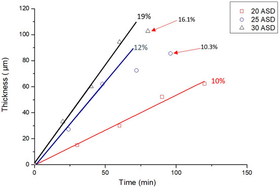 Figure 2 shows the thickness variation and the current efficiencies of Cr- and Fe-based alloy deposits in terms of the electroplating current densities and electroplating periods. The current efficiency of Cr-Fe-C alloy electrodeposition gradually rises with increasing the electroplating current density. The current efficiency of 10% was detected from the electroplating with 20 ASD. It increases to 12% in the electroplating with 25 ASD in the first 50 min, and then gradually decreases to 10.3% after the electroplating for 80 min. The same trend can be found from the electroplating with 30 ASD: its current efficiency is 19% in the first 60 min, and then decreases to 16.1% for 75 min. The decrease in the current efficiency of electroplating with relatively high electroplating current densities could be attributed to concentration depletion of Cr3+ and Fe2+ ions adjacent to the cathode. That is, the concentrations of Cr3+ and Fe2+ ions could be obviously consumed near to the cathode with increasing the electroplating time at a relatively high electroplating current density, leading to a decrease in their reduction rates.