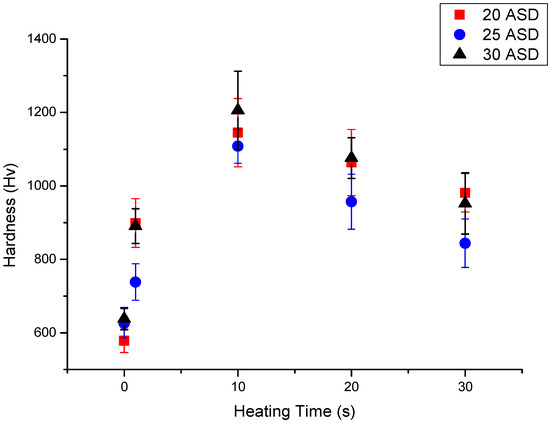 Hardness variation of Cr-Fe-C alloy deposits after rapid thermal annealing (RTA) at 500 °C from 1 to 30 s.