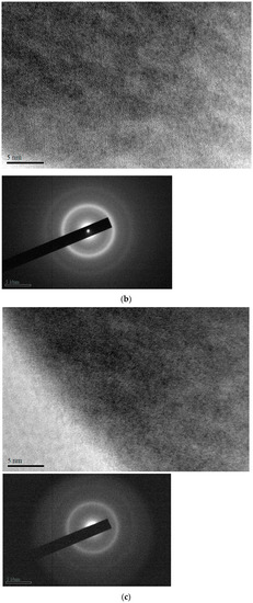 Figure 4a–c show the lattice images and the electron diffraction patterns of as-plated Fe- and Cr-based alloy deposits prepared with 20, 25 and 30 ASD, respectively. As shown in Figure 4a–c, nearly amorphous structures were observed for the as-plated Fe- and Cr-based alloy deposits. Only a few crystalline particles with a size smaller than 3 nm were found for the as-plated alloy deposits electroplated with current densities of 20 and 25 ASD. A fully amorphous structure was observed from the as-plated Cr-based alloy deposit prepared with 30 ASD. This can be recognized from their lattice images and electron diffraction patterns in which broad faint rings with a halo background were observed.