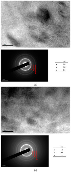 The lattice images of the Fe- and Cr-based alloy deposits after annealing at 500 °C for 10 s are shown in Figure 5a–c; here, a crystalline structure was detected in the anneal-hardened alloy deposits. This can also be deduced from the observed electron diffraction patterns of these deposits in which sharp rings were detected. That is, the prepared alloy deposits markedly crystallized after annealing at 500 °C for 10 s. Grains with a size of 5–15 nm were observed in the annealed alloy deposits (see Figure 5a–c). Many researchers [24] have noted that the precipitation of Cr carbides is the hardening mechanism for the anneal-hardened Cr-C deposit. However, in this study, Cr carbides were not found in the anneal-hardened Cr- and Fe-based alloy deposits. This means that the precipitation of Cr carbides is not the hardening mechanism for the annealed Fe- and Cr-based alloy deposits.