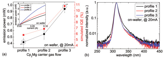 In this series, the aluminum composition profile of the EBL was kept constant (stepped EBL) and the CpMg carrier gas flow was varied during the growth of the EBL. Figure 2a shows the averaged (>250 LEDs per wafer) on-wafer emission power of 310 nm LEDs with the temporal CpMg carrier gas flow profiles 1, 2 and 3 measured at 20 mA. Typical emission power vs. current characteristics of the LEDs are shown in the inset of Figure 2a.