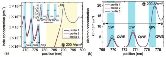 The calculated hole and electron concentrations in the active region at a current density of 200 A/cm are shown in Figure 3a,b, respectively. The hole and electron concentration and therefore the radiative recombination rate are highest for the LED structure with profile 3. This can be attributed to the highest magnesium concentration and thus the highest hole concentration in this LED in comparison to the other two. Furthermore, the simulations of the three structures show different energetic shifts of the valence and conduction band edge of the EBL, which influence the effective band offset between the last quantum well barrier and the EBL (not shown here). Electrons in the LED structure with profile 3 see a 15.5 meV and 20.3 meV higher potential barrier for the electrons compared to electrons in the LED structures with profile 2 and 1, respectively. Therefore, the electron leakage current is reduced with increasing magnesium doping, which results in a higher electron concentration in the active region. The lowest carrier concentration in the active region is observed for the LED structure with profile 1. In this case, the first undoped 3 nm of the EBL results in an inefficient hole injection into the active region and an elevated electron leakage over the EBL because of the reduced EBL potential barrier height.
