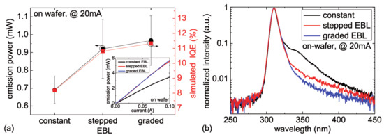 (a) measured average emission power (at 20 mA, on-wafer) as well as simulated IQE and (b) typical normalized emission spectra (at 20 mA, on-wafer) of 310 nm LEDs with different profiles of the aluminum composition in the EBL. Inset in (a): typical emission power vs. current characteristics of 310 nm LEDs with these different EBL designs.