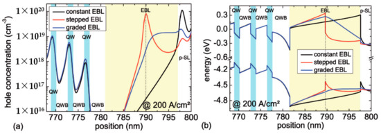 The calculated hole concentrations as well as the calculated conduction and valence band profiles around the active region and the EBL at a current density of 200 A/cm are shown in Figure 5a,b, respectively. The data indicates that the highest hole and electron concentration (electron concentration is not shown here) and, therefore, the highest radiative recombination rate can be found for the LED structure with the graded EBL. A slightly lower carrier concentration can be observed for the LED structure with the stepped EBL. The carrier concentration is lowest for the LED with the constant EBL. This can be explained by the band structure around the EBL. On the one hand, the EBL of the LEDs with the graded and stepped EBL results in a higher potential barrier in the conduction band for the electrons in comparison to the constant EBL. Therefore, the electron leakage current is reduced (see also low parasitic luminescence in Figure 4b) and the electron concentration in the active region is enhanced. On the other hand, the LEDs with the graded and stepped EBL show only a 28 meV high potential barrier for the holes in the valence band at the upper EBL interface. In contrast, this potential barrier is around 189 meV for the LED with the constant EBL which leads to an accumulation of holes and a reduced hole injection into the active region. An analysis of the simulation results suggests that the accumulation of holes in the middle of the stepped EBL does not considerably hinder the hole injection. Therefore, the combination of the improved electron confinement in the active region and the improved hole injection into the active region results in an enhancement of the emission power of LEDs with the stepped and graded EBL design compared to the LEDs with the commonly used constant EBL design.