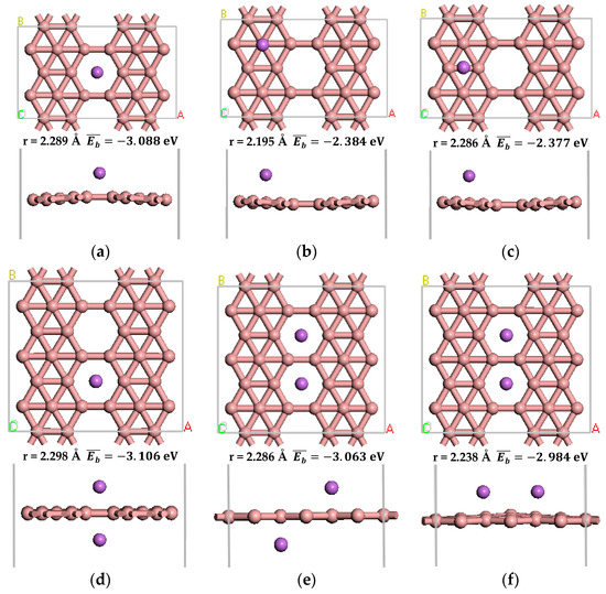 We examined the adsorption of Li atoms on pure β12-borophene. After optimization, we obtained three different stable adsorption structures, as shown in Figure 3a–c. Similar to Li-decorating graphene [37], the most favorable Li adsorption site on β12-borophene is the hollow center of B ring (Figure 3a).
