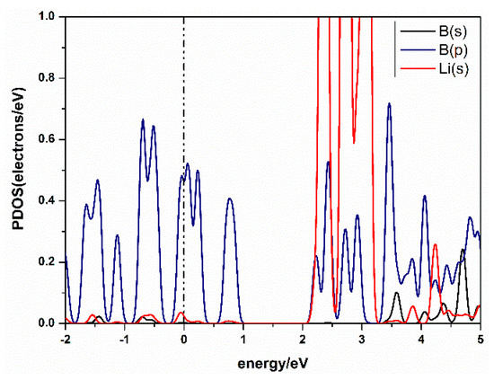 The charge transfer between atoms can be analyzed by Mulliken analysis [40], which shows that the charge was transferred from Li to B. From the Partial Densities of States (PDOS) of the Li-β12-borophene structure in Figure 4, we found the peak of B atom’s 2p orbital overlaps with the peak of the Li atom’s 1s orbital. This suggests a strong hybridization between B and Li atoms. A similar binding mechanism has also been confirmed in other metal-modified nanostructures [41]. In addition, it can be seen from the PDOS that the metal properties of β12-borophene did not change after modification of Li atom.