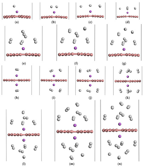 There are three stable adsorption structures of two Li atoms after adsorption on the β12-borophene as shown in Figure 3d–f, respectively. One of the most stable adsorption sites involves the two Li atoms being located on both sides of the same B ring. The distance between Li and the nearest B is 2.298 Å. The average adsorption energy is −3.106 eV, which is larger than the cohesive energy of Li atoms. After optimization, the relaxation of β12-borophene is very small. Each Li atom in the Li-β12-borophene system is an active adsorption site, allowing a large number of H2 molecules to be adsorbed around the Li atom in order to significantly increase the hydrogen storage capacity.