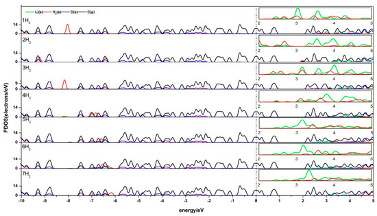 PDOS of Li-β12-borophene with 1–7 H2 molecules adsorbing. (The PDOS of Li-s orbit and H-s orbit in the range of 2.0 eV~5.0 eV is enlarged as shown in the small box above each corresponding figure.)