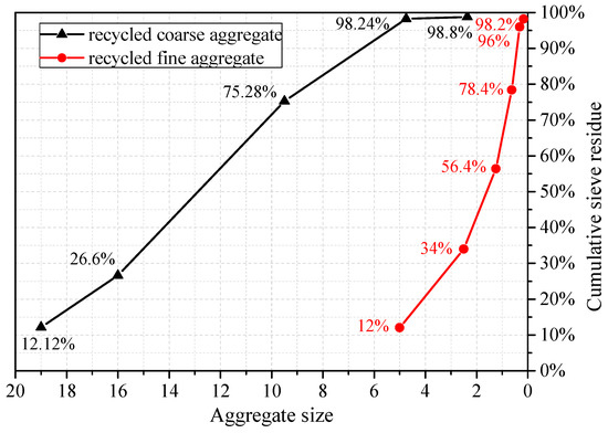 Particle size distribution of recycled coarse and fine aggregates.