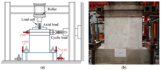 Measurement: The loads, displacements and strains were measured during the test. Load cells were used to measure the vertical load and the horizontal load applied to the specimens. The Linear Variable Differential Transformers (LVDTs) were used to measure the displacement of the specimens. The layout of the LVDTs is shown in Figure 5a. Two LVDTs were used to measure the horizontal displacements at the loading beam, which was 1000 mm from surface of the foundation. Another two LVDTs were used on the foundation to monitor the slippage and lean of the foundation. Strain gauges were mounted at the vertical reinforcing bar of the boundary elements, the vertical and horizontal distributed reinforcing bars and the X-shaped rebars brace.