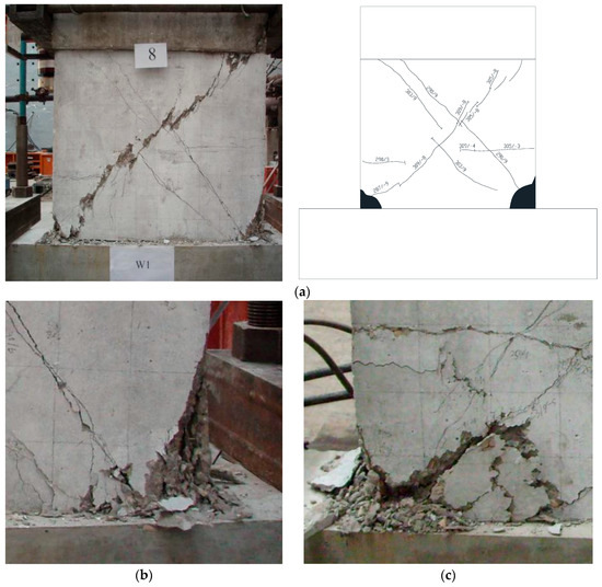 Figure 7a shows the failure characteristics of specimen W1. The failure process of specimen W1 was as follows: when the horizontal load was 195 kN, the horizontal short cracks formed at the base of the boundary elements. With the process of the loading, the cracks developed into the web region obviously and the inclined cracks developed and climbed along the height of the wall. With the development of the loading, the crush of the concrete at the base of the wall became significant. Other specimens W2 and W3 with RCA had almost identical failure characteristics with specimen W1. However, for specimen W4 with 100% RCA and 100% RFA, the damage of the concrete at the base of the wall was more serious than specimen W1 with natural aggregates, as shown in Figure 7b,c, respectively. This indicated that more cumulative damages occurred for those specimens using the recycled aggregates. In order to prevent the serious damages, in the design of the RCA or RFA concrete shear walls, some strengthen method, such as the Fiber Reinforce Plastic (FRP) or steel plate strengthen method may be taken into account to reduce the concrete damages.