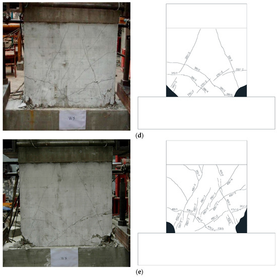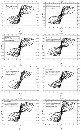 Figure 7d shows the failure characteristics of the specimen W5 with higher axial force ratio. As shown, compared with the specimen W1, no obvious 45° inclined cracks were found due to the higher axial force ratio. Figure 7e shows the failure characteristics of the specimen W8 with the X-shaped brace. Different from specimens W1, W2, W3 and W4, no obvious 45° inclined cracks were found. It is confirmed that the brace had a positive effect on restraining the inclined cracks. Since the X-shaped brace is simple and economical during the design and construction of the concrete shear walls, when using RCA or RFA, it is suggested to install the X-shaped brace to reduce the damage of the concrete.