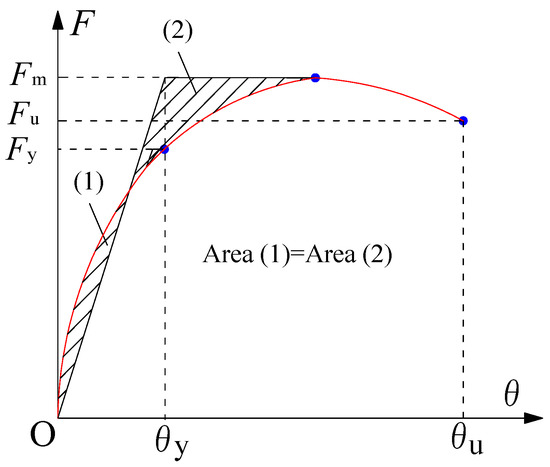Table 6 shows the strength and deformation capacity of the specimens. In the table, Fc is the crack load, Fy is the yield load, Fm is the maximum load, θc is the crack drift ratio, θy is the yield drift ratio and θu is the ultimate drift ratio. Where, the Fc and θc was the load and drift ratio when the initial cracking occurred. The yield load Fy and θy was determined by the energy equivalent method [33], as shown in Figure 9. θu is the ultimate drift ratio, which is defined as the strength decreases to 85% of the maximum load.
