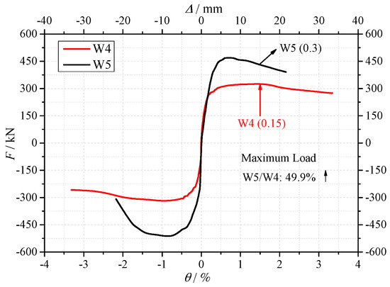 The axial force ratios of specimen W5 and specimen W4 were 0.3 and 0.15, respectively. The skeleton curves of the two specimens are shown in Figure 11. As shown in Figure 11 and Table 6, the crack load, yield load and maximum load of specimen W5 were 61.4%, 47.5% and 49.9% higher than specimen W4, respectively. It is indicated that under higher axial force ratio, the shear resistance of the shear wall increased significantly. This is mainly due to two reasons: (1) with the increase of the axial force, the shear force carried by the concrete wall increases; (2) The development inclined cracks will be restrained, in consequence, the shear resistance increases.