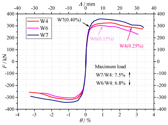 Figure 10 shows the comparison of the skeleton curves of the specimen W1, W2, W3 and W4. As shown in Figure 10 and Table 6, the observations are as follows.