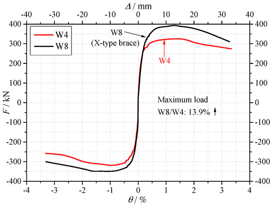 The skeleton curves of the specimens W4 and W8.