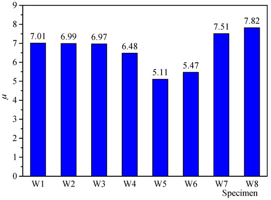 Ductility ratio μ is an index to describe the deformation capacity of the shear walls without significant strength degradation. Ductility ratio μ is defined as μ = θu/θy. The higher the ductility ratio is, the better deformation capacity becomes. The ductility ratio of each specimen is shown in Figure 14. From Figure 14, according to the limited configurations considered in this study, the following observations can be obtained.