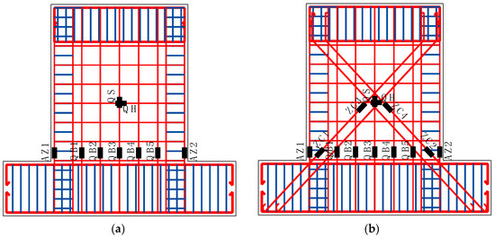 The location and numbering of the strain gauges. (a) Specimens W1, W2, W3, W4 and W5; (b) Specimen W8.