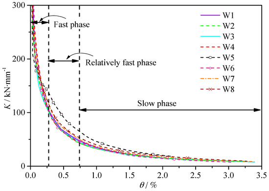 The stiffness of the shear wall became smaller with the increase of the drift ratio. In general, the degradation of stiffness can be roughly divided into three phases: (1) Fast degradation phase, which is from the start of the loading to the appearance of the crack; (2) Relatively fast degradation phase, which is from the appearance of the crack to the yielding of the specimens; (3) Slow degradation phase, which is from the yielding of the specimens to the end.