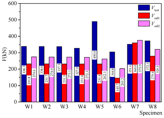 Figure 18 shows the test results and the calculated results based on the two design codes. It is indicated that the evaluation based on the ACI 318-14 was more conservatively, while the EC8 strength evaluation method showed a better accuracy. The average ratio of the test value Vtest to the calculated value Vcal1 was 1.54, and the average ratio of the test value Vtest to the calculated value Vcal2 was 1.30. However, the comparison results of specimen W5 with higher axial force ratio had a higher error. This is because the two design codes consider few on the effect of axial stress.