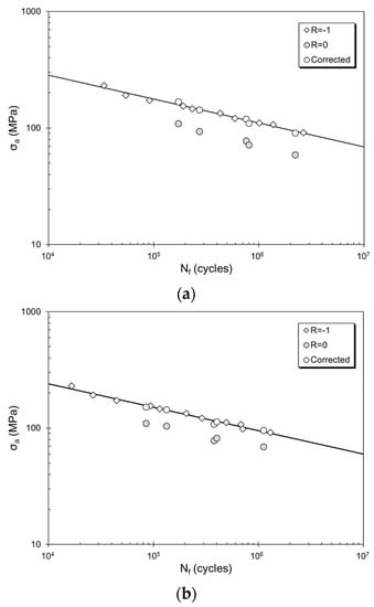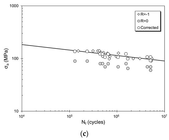 The S–N curves at R = −1 after Walker mean stress correction for (a) sand cast F357 by Jana et al. [37], (b) A357 by Mu et al. [35], and (c) friction stir processed F357 by Jana et al. [37]. The original data for R = 0 as well as their correction according to Walker equation (Equation (2)) are also indicated.