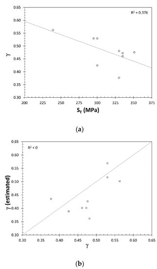 Dowling et al. reported γ0 and a to be 0.883 and 2 × 10−4 MPa−1, respectively, for steels. The same authors stated that γ = 0.651 when ST is between 300 and 350 MPa, and γ = 0.473 for ST values between 450 and 600 MPa. Lv et al. [8] stated that γ is expected to be low for materials with low ductility and proposed the following equation to determine the Walker parameter: