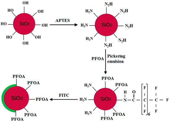 At present, the study of foam stabilized by nanoparticles for enhancing oil recovery mainly includes homogeneous modified particles and mixtures of particles and surfactants. The homogeneous particles with uniform surface wettability have been employed for Pickering stabilization. The adsorption of the homogeneous particles at the gas–liquid interface mainly depends on their size and wettability, which determines the contact angle θ of the particles at the interface [20,21,22]. Utilization of the homogeneous particles for the preparation of Pickering emulsions requires large amounts of energy, which are generally derived from strong shear or ultrasonication, to force the particles at the interface to pass the energy barrier [23]. In the mixtures of particles and surfactants, a similar synergistic effect exists among different surfactants [24,25,26]. Compared to a sole particle or surfactant, both the foaming ability and foam stability of the mixtures improve substantially. However, the surface activity of the mixtures significantly decreases at high temperature, which makes the mixtures lose their synergistic effect. Therefore, the question concerns the ability of amphipathic particles to overcome the energy barrier and enhance their kinetics, thereby allowing their spontaneous adsorption onto the interface without the necessity of excess shear. Amphipathic particles can combine their anisotropic wettability and high interfacial activity with the Pickering character to irreversibly adsorb to the interface. Very recently, further progress has been made in the application of amphipathic particles as solid surfactants to effectively stabilize emulsions and achieve longer-term stability as compared to those stabilized by low molecular weight surfactants and homogeneous particles [27,28,29,30,31,32,33,34]. Nevertheless, the amphiphilic fluorinated silica nanoparticles are rarely synthesized for the stabilization of the air–water surface.