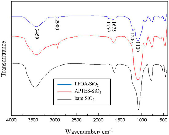 The FTIR spectra of the bare and modified silica particles are illustrated in Figure 3. In the case of the bare silica particles, the sharp band at 3450 cm−1 corresponded to the presence of silanol groups (Si–OH) on the silica surface. The absorption bands at 1675 cm−1 and 1100 cm−1 are related to the bending vibration of H2O and the isolated terminal silanol (Si–OH) groups, respectively. The spectra of the silica particles modified with APTES exhibited weakened silanol groups (Si–OH) and H2O absorption bands, which may have been a result of the APTES modification. Moreover, the spectra of the modified particles manifest a band at 2980 cm−1, which is attributed to the asymmetric stretching of the C–H bond due to the presence of aminopropyl groups. As for the amphiphilic fluorinated nanoparticles, the absorption bands at 1200 and 1750 cm−1, which are assigned to the stretching vibration of –C–F– and C=O, indicated the presence of the PFOA layer in the fluorinated particles.