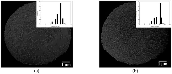 In the synthesis process of Janus particles by the Pickering emulsions method, the silica particles assembled on the oil–water interface were immobilized on the surface of the wax colloidosomes during wax solidification. The colloidosomes structure was analyzed by SEM, as presented in Figure 4. The silica particles modified with APTES packed more closely and orderly on the surface of the wax colloidosomes compared to the bare ones, which markedly increased the efficiency of the modification process. In addition, there was no significant difference in particle size distribution between the bare and modified silica particles.