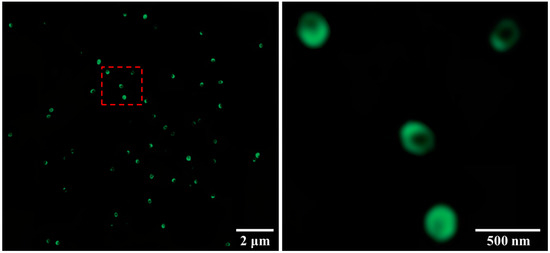 In the synthesis process of the Janus particles by the Pickering emulsions method, although the original method described by Granick et al. [39] also facilitates the migration of the silica particles towards the oil–water interface by increasing the surfactant concentration, the excess of surfactants reduced the amount of available functional groups (Si–OH) that acted as anchors to the silane coupling agents, thereby significantly decreasing the efficiency of the modification stage [40]. The wetting response is a common result of the transformation of the functional groups on the particle surface and variations in the surface roughness of modified silica particles. The terminal silanol groups on the silica particle surfaces were substituted by more hydrophobic amino groups which enhanced the hydrophobicity of the silica particles. Additionally, silica particles modified with APTES exhibited lower surface-free energy values (ϒAPTES = 49 mJ/m2) as compared to those of the bare silica particles (ϒSiO2 = 72 mJ/m2). Therefore, the modified silica particles possessed a higher affinity to the hydrophobic wax (ϒwax = 32 mJ/m2) [41]. According to the Wenzel model for a hydrophilic surface with a Young’s contact angle of <90°, the hydrophilicity is expected to increase following an increase in surface roughness as the liquid penetrates the roughness features [42,43]. Although a silane layer may build a hierarchical nano/micro structure (surface roughness), the difference in the contact angle is mainly a result of the transformation of the functional groups on the particle surface. Fluorescence microscopy (Figure 5) verified the asymmetric surface modification of the obtained Janus particles. This not only confirmed the Janus character of the particles but also showed that silica particle surfaces originally shielded by wax were still active after further chemical modifications.