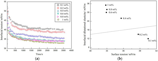 According to Figure 6a, the surface tension dropped rapidly in the early stages and then reached equilibrium at different observed concentrations. At higher amphiphilic nanoparticle concentrations, the surface interfacial tension rate decreased and reached a lower equilibrium level. Additionally, as the amphiphilic nanoparticle concentration increased, the equilibrium surface tension kept decreasing until it reached the critical concentration, at which point the adsorption of the amphiphilic nanoparticles at the air–water interface was saturated. At the critical concentration (0.6 wt %), the equilibrium surface tension dropped to around 32.7 mN/m. A dilational elastic modulus of E > ϒ/2, also called the Gibbs stability criterion, is a foam stability evaluation criterion [18]. According to Figure 6b, the Gibbs stability criterion was fulfilled for dispersions with amphiphilic nanoparticle concentrations greater than 0.2 wt %.