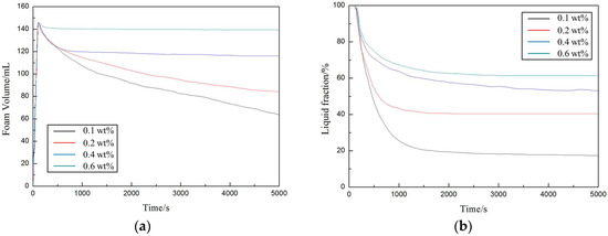 The time-dependence of the foam and liquid volumes at different foam concentrations was also investigated, as shown in Figure 7.
