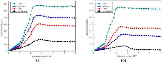 Figure 8 shows the plugging capacity of four foam systems under the reservoir condition of 40 °C, and 80 °C. The core permeability is 10 μm2, and the injection rate is set as 0.6 mL/min. The results of Figure 8 express that the resistance factors of the amphiphilic particles foam system is higher than other foaming systems under two temperature conditions; it also shows superior plugging capacity. The amphiphilic particles foam system can stabilize the foam better under two temperatures. Under the high temperature of 80 °C, the plugging capacity of foam stabilized by amphiphilic particles reveals more outstanding advantages. The resistance factors of surfactants and the mixture of nanoparticles and surfactants decreased significantly at 80 °C as compared to those at 40 °C.