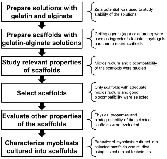 The microstructural and physical properties, as well as biological response, were then characterized, via myoblast culture and histochemical techniques. The experimental strategy followed in this study is outlined in Figure 1.