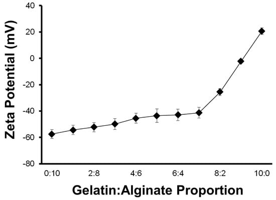 The first step to producing these polymer scaffolds was to obtain stable hydrogel precursor solutions without precipitation of the ionic components, salmon gelatin and/or sodium alginate. Conventionally, for colloidal dispersions, Zeta potential values in ranges over |30| mV are considered stable dispersions [30]. The evaluation of the zeta potential of the gelatin and alginate-containing solutions at different ratios showed that high colloidal stability was maintained at gelatin:alginate ratios of <7:3, and more ideally <6:4 (Figure 2).