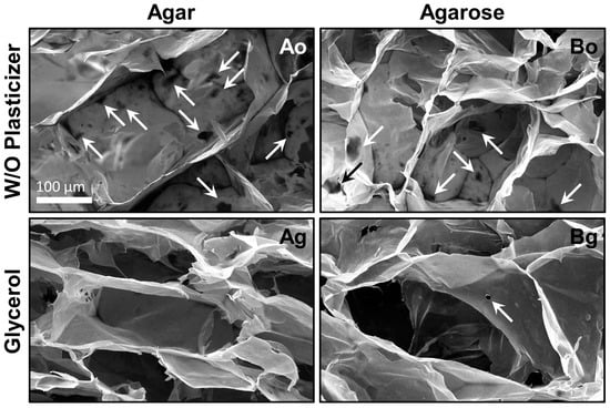 The first scaffolds prepared were made using salmon gelatin and alginate (in equal proportions) with gelling excipient (agar or agarose) and without plasticizer. SEM micrographs of the microstructures obtained when agar (formulation Ao) or agarose (formulation Bo) were used as gelling agents are shown in Figure 3. The materials obtained exhibited unsatisfactory morphologies, with significant defects in the pore walls (micro-holes, arrowed). The average of micro-holes for materials Ao and Bo were close to 4.2 and 3.6 per pore, respectively. This damage could be the result of the freeze-drying processes, since it is known that dry salmon gelatin has crystalline domains [21], and can fracture easily.