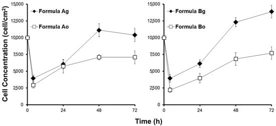 The growth of myoblasts was markedly more rapid within the scaffold with glycerol, and notably slow in the absence of this plasticizer (see Figure 4). This indicates that the microstructure of the scaffold without plasticizer was not adequate to grow muscle cells. The use of glycerol as a non-toxic plasticizer served to improve scaffold performance. For subsequent studies, only scaffolds containing plasticizers in their formulations were carried through for study. Based on these results, it was decided to perform physical and biological characterizations of both edible scaffolds (formulations Ag and Bg) using the selected plasticizer (glycerol).