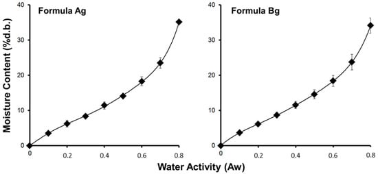 Sorption isotherms of both scaffolds (Ag and Bg) are shown in Figure 5. The monolayer moisture content calculated from the GAB model is shown in Table 2, and indicates that scaffold formulation Bg was more hygroscopic than scaffold Ag (p < 0.05; t-test). In addition, the water uptake ratio in the scaffold made with agarose was higher than agar (p < 0.05; t-test) (see Table 2). These results indicate that the scaffolds made with agarose had better water interaction capacity.