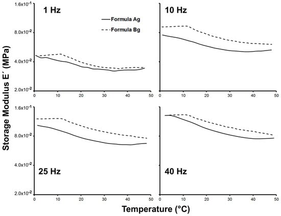 The storage modulus (E’)—which is associated with the stiffness of the material—was determined in the hydrated condition at different frequencies and temperatures, and showed frequency dependency for both Ag and Bg scaffolds. The latter has been reported in hydrogels composed of bovine gelatin and alginate in the same frequency range, which exhibit elastic behavior [33]. Furthermore, it has been reported that stiffness is a physical property that can regulate gene expression, adhesion, and proliferation of the muscle cells [34].