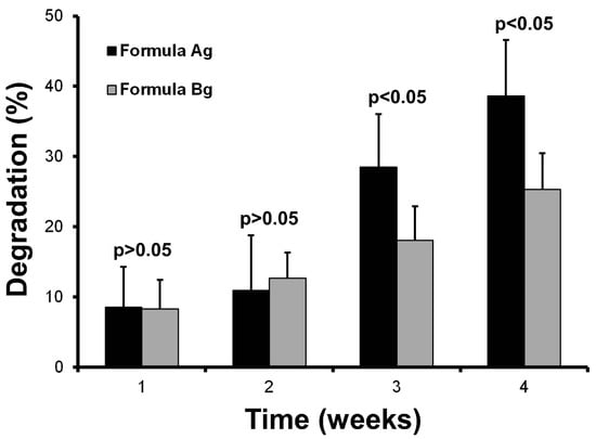 The capacity of a material to resist degradation by biological agents is an essential attribute for designing scaffolds that provide long-term conditions and mechanical strength. The degradation produced by lysozymes at 37 °C is a standard assay to compare scaffolds that will be used to culture cells. Figure 7 shows the in vitro biodegradation of the edible scaffolds (formulations Ag and Bg) incubated in simulated physiological conditions.