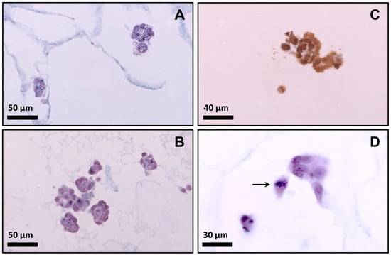 Behavior of myoblasts inside the scaffold after 48 h of seeding. (A) Photomicrograph of scaffold Ag (histochemical technique); (B) Photomicrograph of scaffold Bg (histochemical technique); (C) Cells seeded on scaffold Bg showing positive immunostaining for BrdU (immuno histochemical technique); (D) Photomicrograph of scaffold Bg (arrowed cell in metaphase).