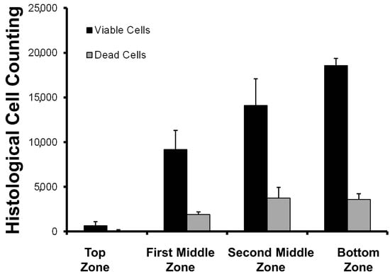 The distribution of the cells inside the selected scaffold (formulation Bg) was not homogeneous (Figure 9). This is an expected result, as cell growth velocity and cell clustering are dependent on nutrients diffusion and oxygen supply [14]. Previous reports have informed us that cell culture into biopolymer blended scaffolds in static culture tend to grow at the bottom of the scaffolds [11]. However, cell viability was high in all scaffold sections. This data is important information for the design of bioreactor systems to model and predict the biomass distribution. In terms of food systems, this parameter could be used to have different layers of muscle fiber across the in vitro meat construct.