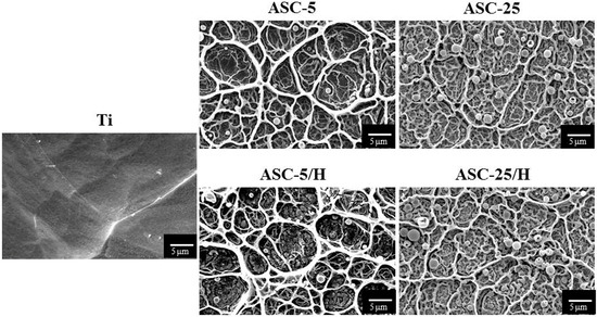 SEM (scanning electron microscope) pictures of the surfaces of the Ti substrate and four types of CA coatings films prepared by the ASC method revealed CA coatings covering the entire Ti surface (Figure 1). The network structure was approximately 10–15 μm and was observed across all four coating surfaces. Spherical particles with diameters of approximately 0.8–1.4 μm were present on the CA coating surface, with more spherical particles identified in ASC-25 and ASC-25/H in comparison to ASC-5 and ASC-5/H. Borders on the network structures were thicker in ASC-5 and ASC-5/H than in ASC-25 and ASC-25/H. The heat treatment produced no distinct differences in the surface morphology.