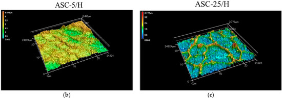 Laser microscopy of CA coatings revealed the three-dimensional surfaces of the heat-treated specimens (ASC-5/H and ASC-25/H), with ASC-25/H showing a clearer network structure (Figure 2). In addition, there were significant differences in both surface roughness parameters Sa (three-dimensional arithmetic height) and Sdr (surface deployment area rate) surface deployment area rate) among three specimens (p < 0.05; Table 1). ASC-25/H showed the greatest roughness (p < 0.05), and the Sa and Sdr values for ASC-25/H were approximately 1.5 and 4 times greater than that for ASC-5/H, respectively.