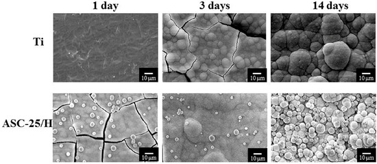 Clear differences were recognized in the crystal formation between Ti and ASC-25/H (Figure 5 and Figure 6). For horizontal placements, there were no crystals on Ti one day after immersion in SBF. However, ASC-25/H showed that network structures were completely covered by the crystals. Three days after immersion, crystals formed on Ti and ASC-25/H. Fourteen days after immersion, increased growth of spherical crystals was observed in ASC-25/H.