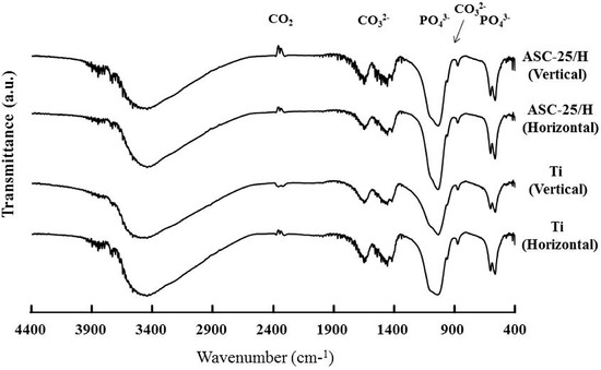 Due to its superior mechanical properties, corrosion resistance, and biocompatibility, titanium (Ti) is widely used in the fields of dentistry, orthopedic surgery—Such as for artificial joints and stents, and maxillofacial surgery [1,2]. In addition to the tight and direct bonding of Ti (known as osseointegration) [3], a type of calcium phosphate coating on Ti, known as hydroxyapatite coating, improves and accelerates the bone healing process [4,5,6]. Various methods for hydroxyapatite coating have been reported, including plasma spray [6,7,8], the sol–gel method [9,10], physical vapor deposition (PVD) [11,12,13], and electrostatic spray deposition (ESD) [14,15]. Among them, PVD can produce thin and uniform apatite coatings, and ESD can deposit carbonate-containing apatite (CA) films on a Ti substrate, which have chemical components that resemble bone minerals [16].